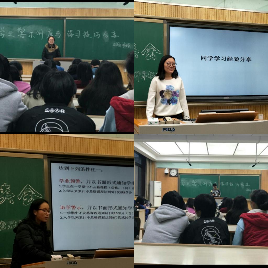 免师二班班长吴翔宇通过和同学们分享三个关键词“尊重,选择,适应”――希望同学们能适应新的环境和新的学习方式,并让大家将学业警示当成动力。免师三班班长撖硕果为大家重点强调了“2”与“6”,即2门次6学分,希望目光长远严要求,力争80分。班内胡雪妮和谭伟同学随后与大家分享了他们的学习经验。