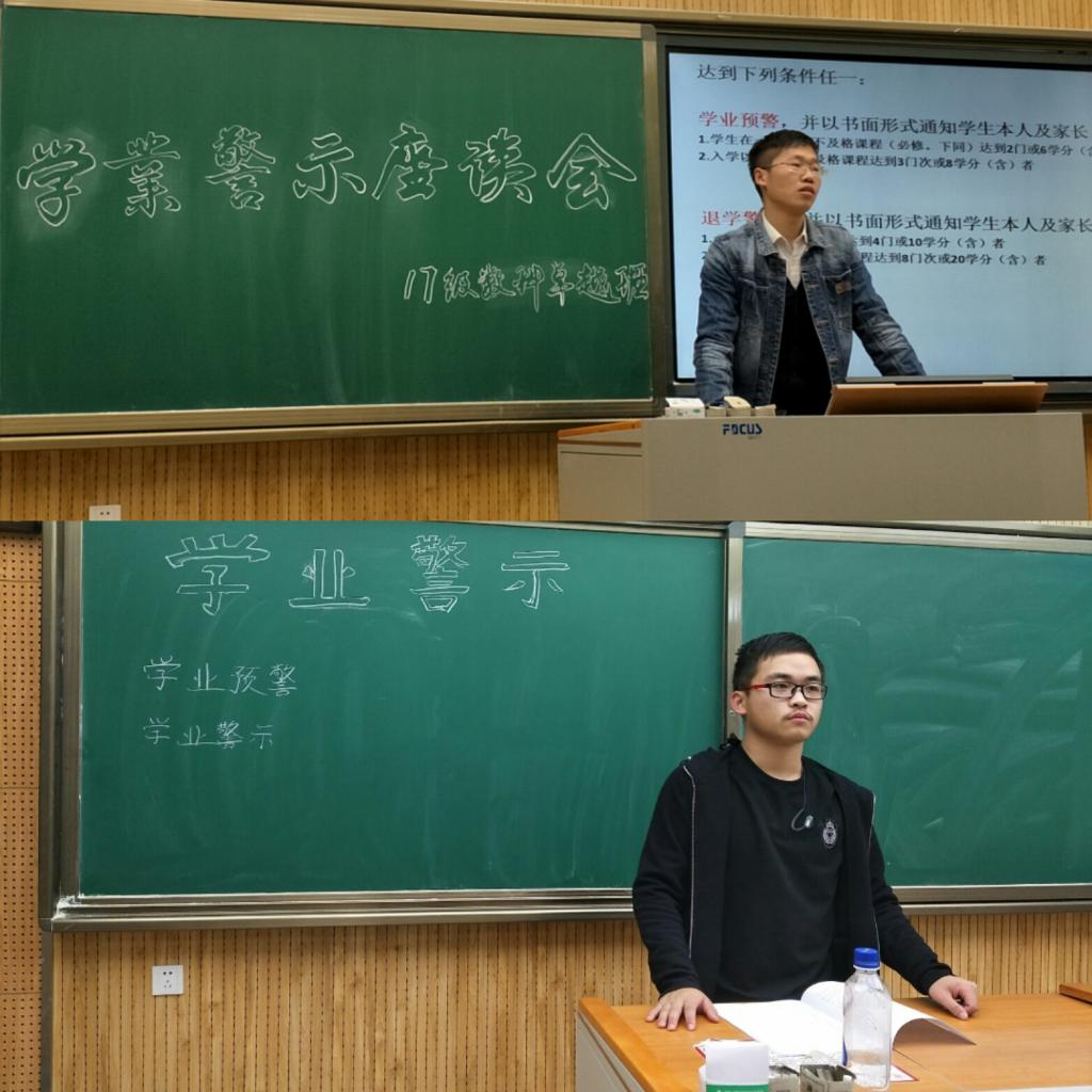 其中,免师一班、非师一班主要由学习委员介绍学校本科生学业警示实施办法(试行),让同学们了解学校这一政策的同时认识到应严格要求自己。非师二班班长李双先为大家讲解了受到学业预警和退学预警的条件,并就这两个警示介绍了解决方案,班内同学认真听取并做了详细记录,并表示会将压力转化为动力,勇于争先,力争第一。